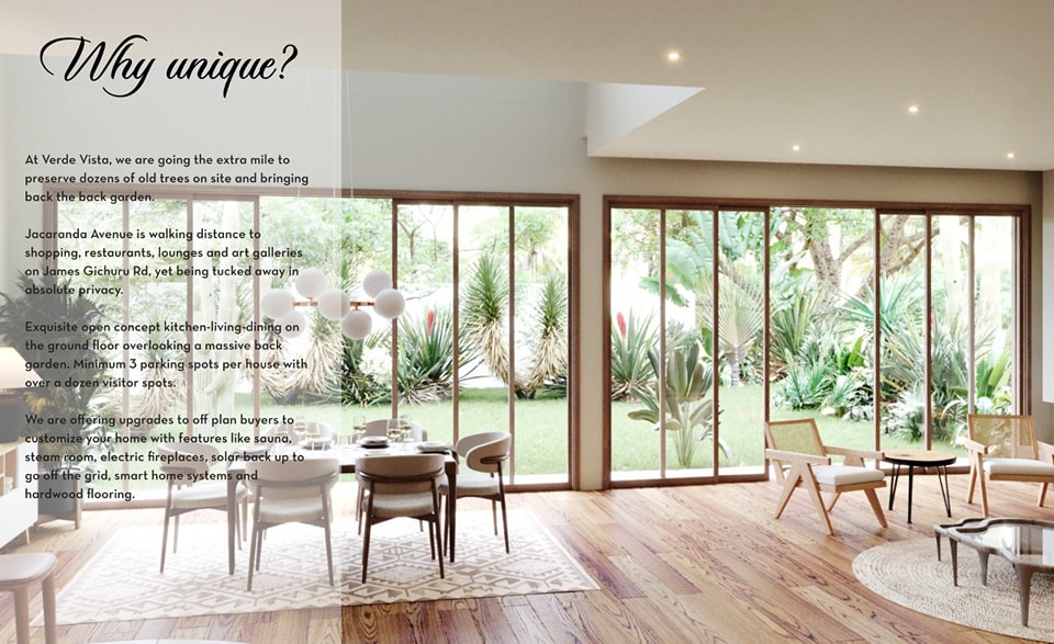 Verde Vista comprises five elegantly designed detached mansions on a lush 1-acre plot in Lavington. Located on the tree-lined, gated, and secure Jacaranda Avenue, this property offers a unique opportunity to own a home nestled among trees and greenery.